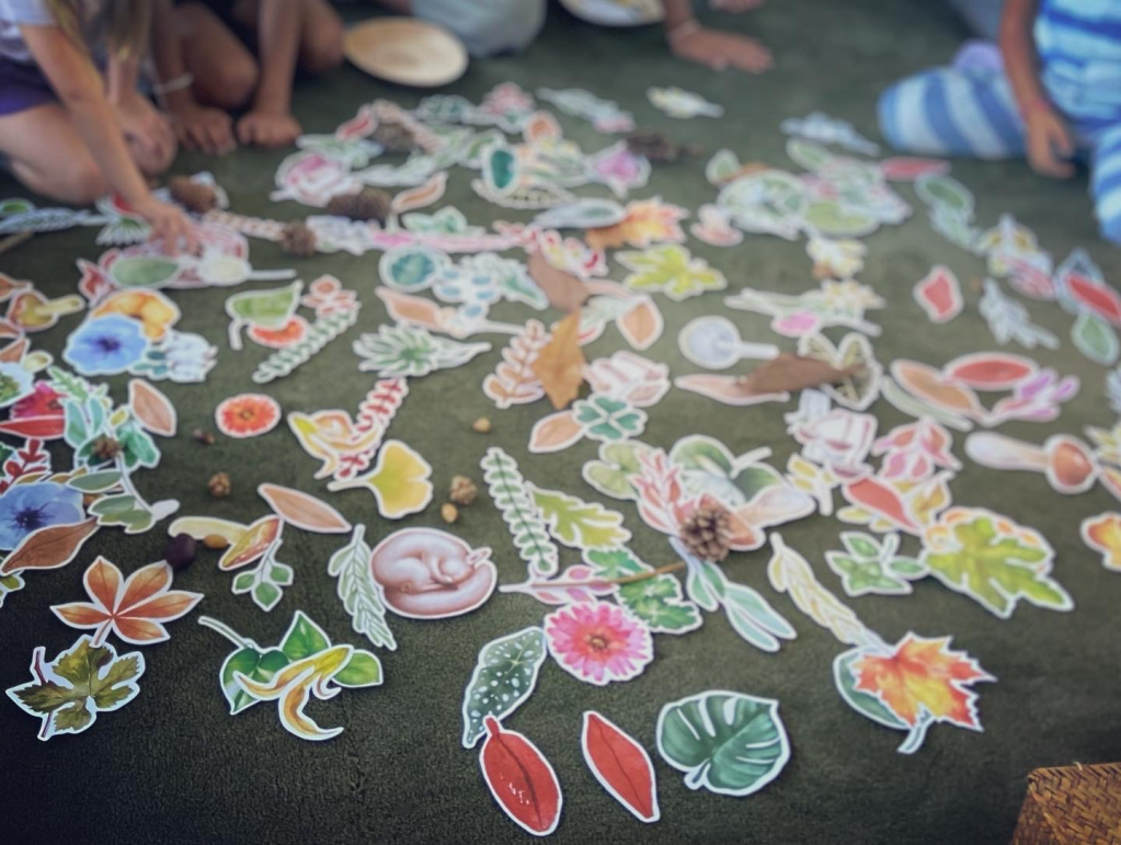 Manto di foglie si svolge a terra. I bambini sono chiamati a riconoscere e trovare piante diverse tra le foglie di un coloratissimo tappeto, in una sfida di osservazione e rapidità che volendo può anche limitarsi all’incanto per gli occhi.